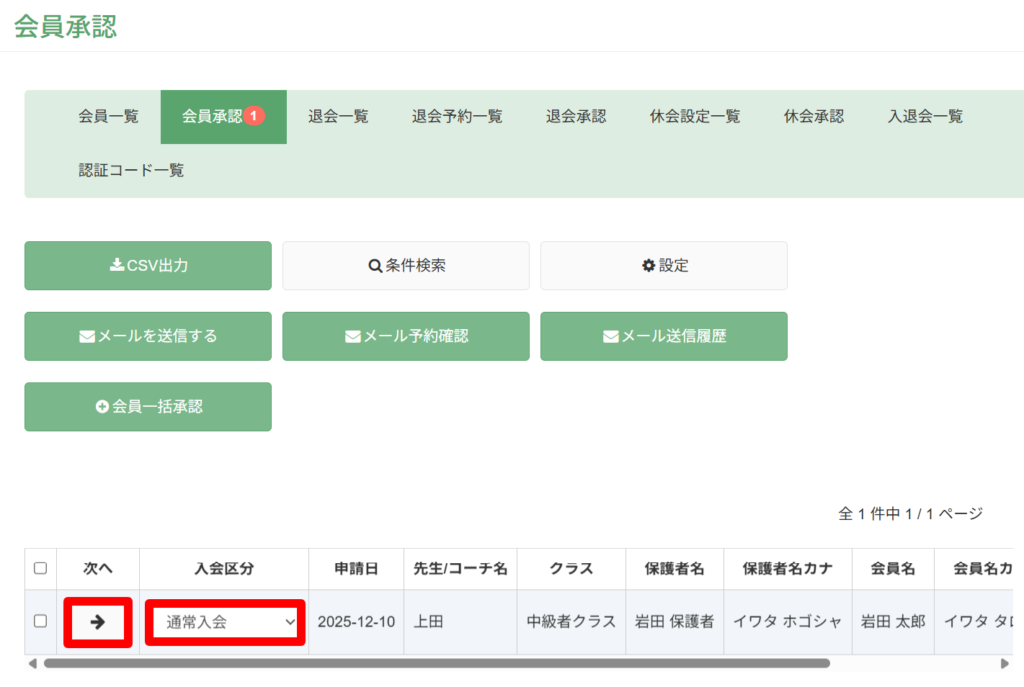 ※クラスの欄には新規会員がフォームで選択したクラスが表示されます。必要に応じて、「→クラス検索」から入会させるクラスを変更することができます。