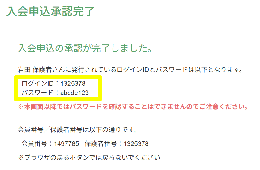 承認完了画面にログインIDとパスワードが発行されます。