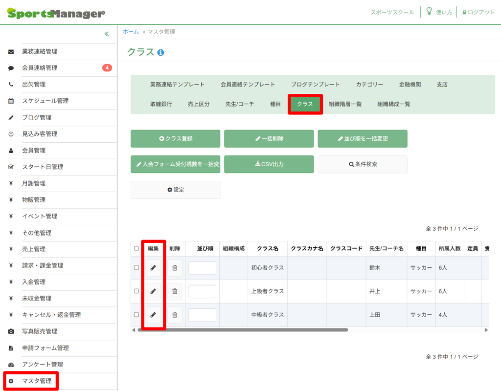 クラスの一覧から対象のクラスの「編集」を押してください。