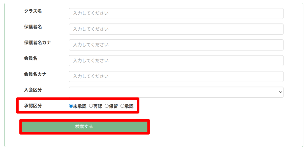 条件検索の「承認区分」から、表示させたいステータスを選択して「検索する」を押すと、条件で絞られた会員が表示されます。