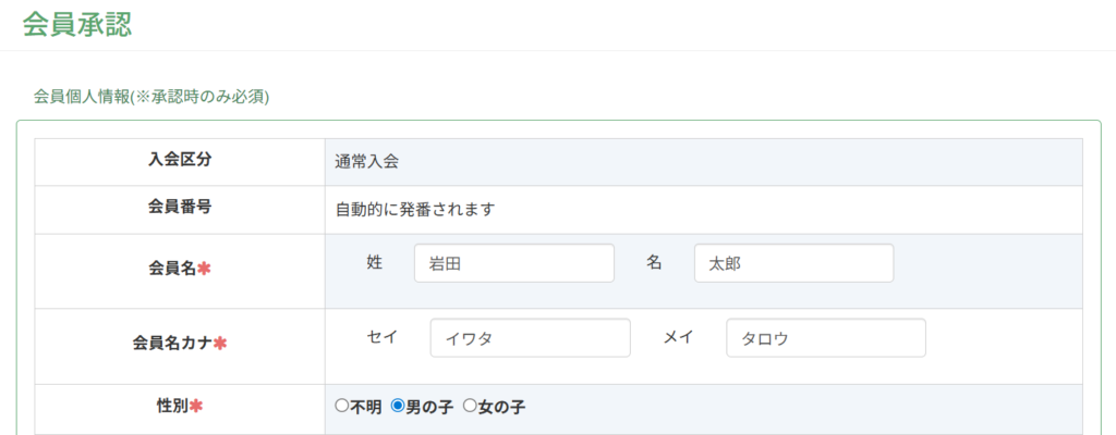 会員・保護者に関する情報は、新規会員が入力したものが自動反映されています。