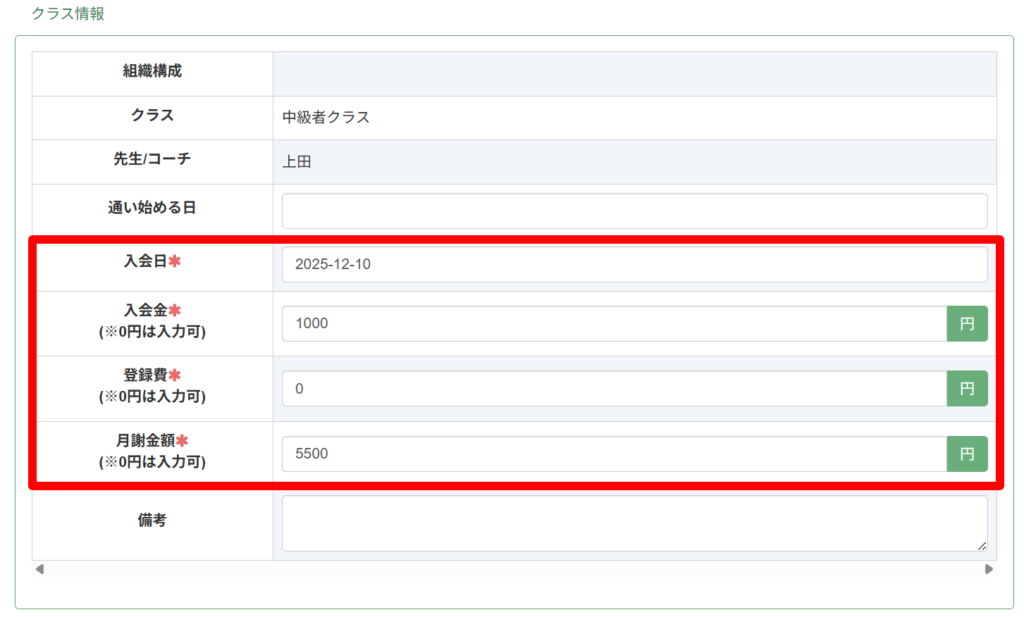 クラス情報の欄にある、「入会日」「入会金」「登録費」「月謝金額」をご確認ください。