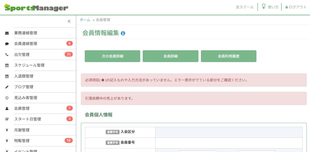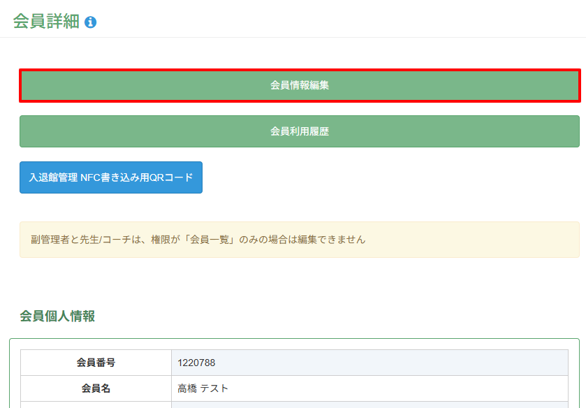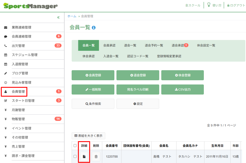 会員管理の会員一覧から、対象の会員の「詳細」ボタンを選択してください。
