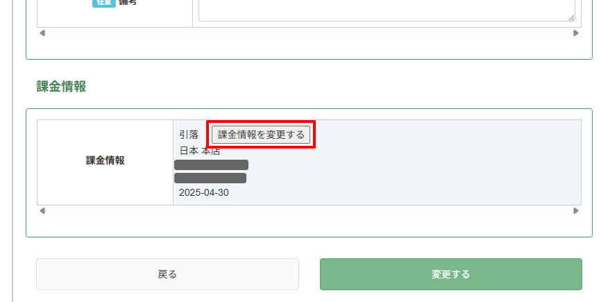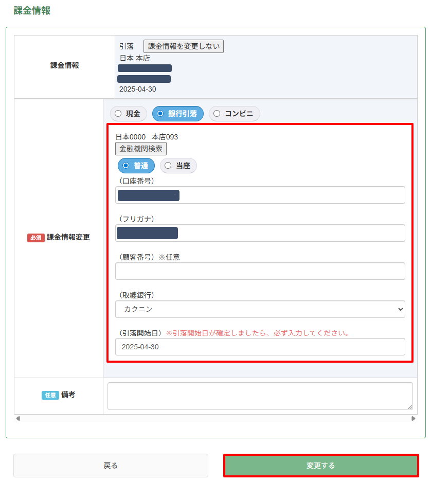 赤枠内の口座情報を変更の上、「変更する」ボタンを押してください。