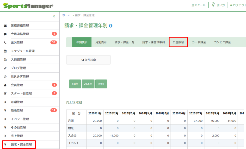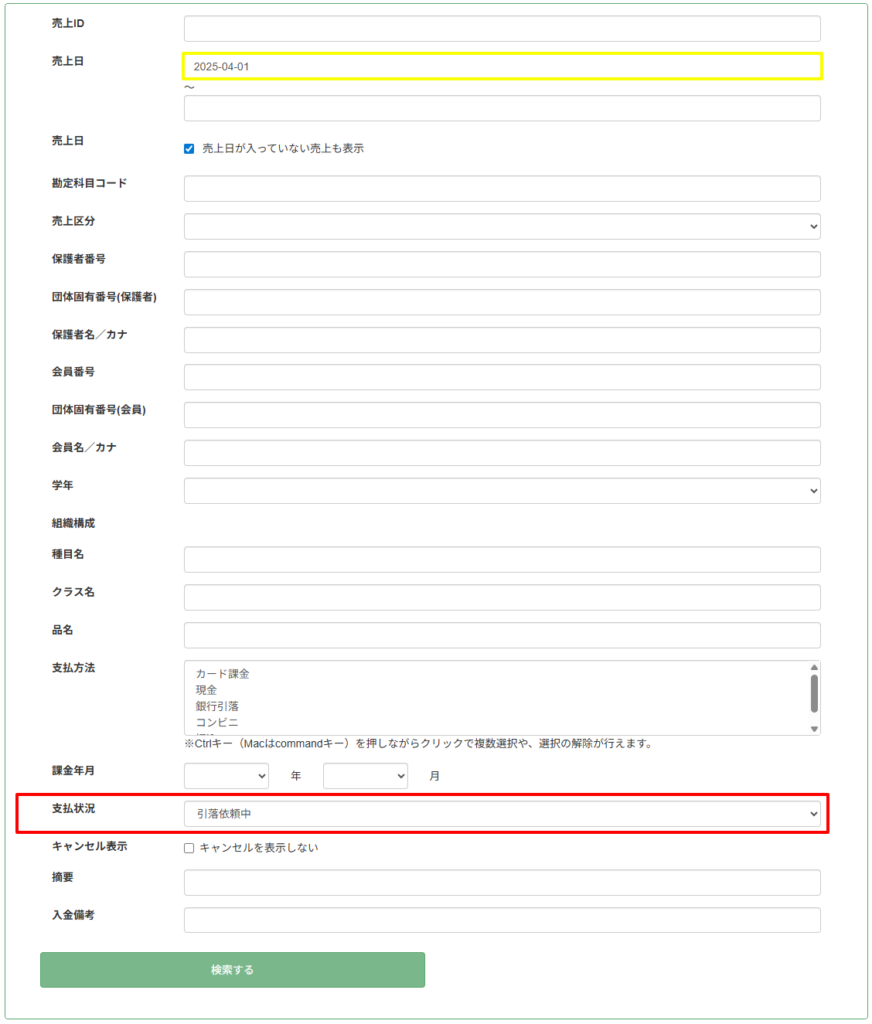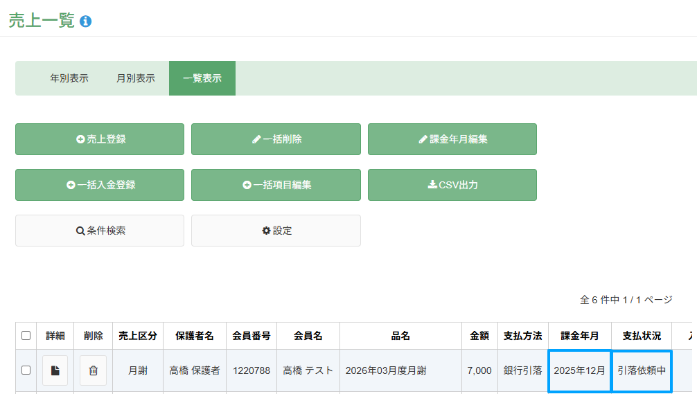 引落依頼中の売上の「課金年月」を確認しておいてください。