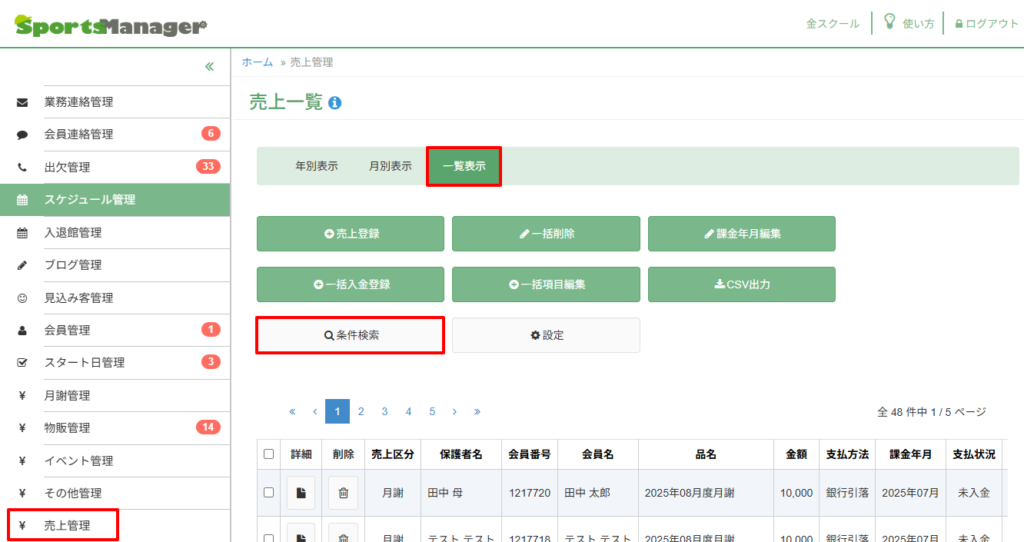 売上管理から一覧表示を選択し、条件検索を押してください。