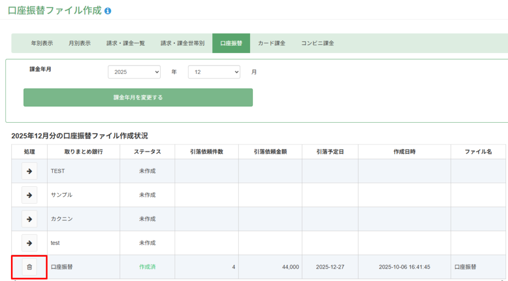 次に、この年月の口座振替作成ファイルを削除していきます。