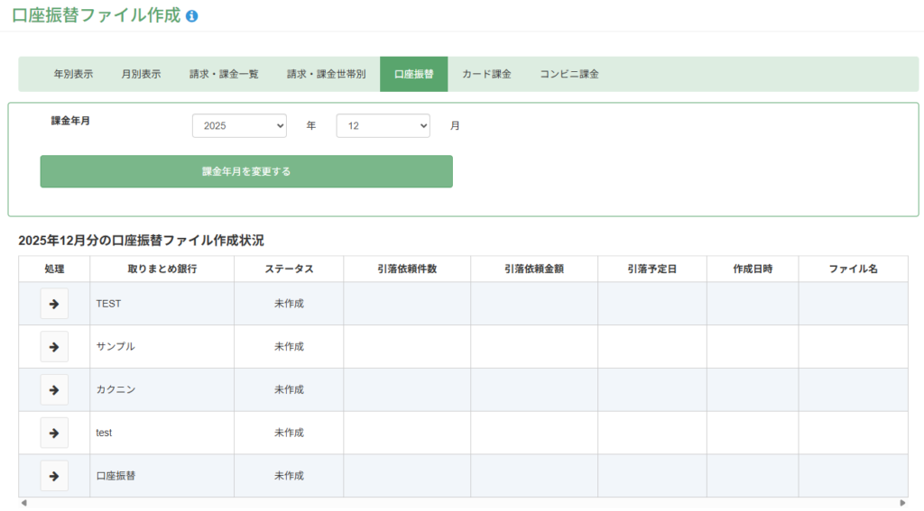 請求・課金管理から口座振替を押し、「口座振替ファイル作成」を選択してください。