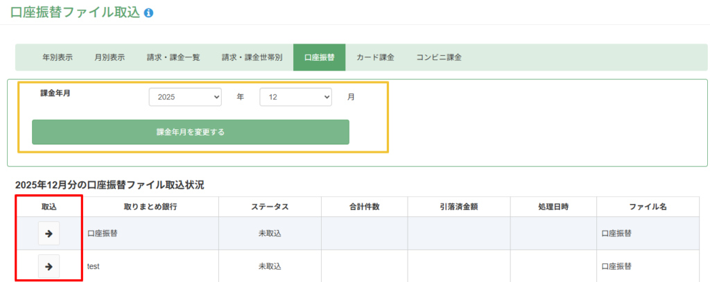 先ほど確認した課金年月を表示させ、対象の会員が利用している取りまとめ銀行の左にある「→」を選択してください。