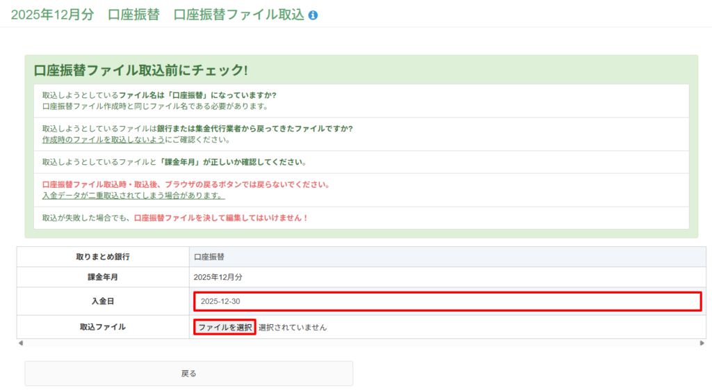 「ファイルを選択」ボタンを押し、請求代行業者から受け取った口座振替結果ファイルを選びます。