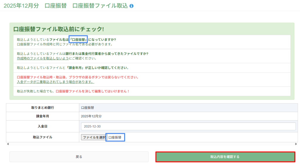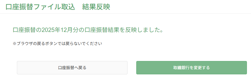 この画面が出たら、口座振替の結果ファイル取込が完了です。
