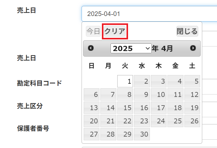 日付部分を選択して出てきた画面(上の画像と同じ画面)で、「クリア」を押すことで過去すべての売上から検索できるようになり、漏れなく売上を抽出することができます。