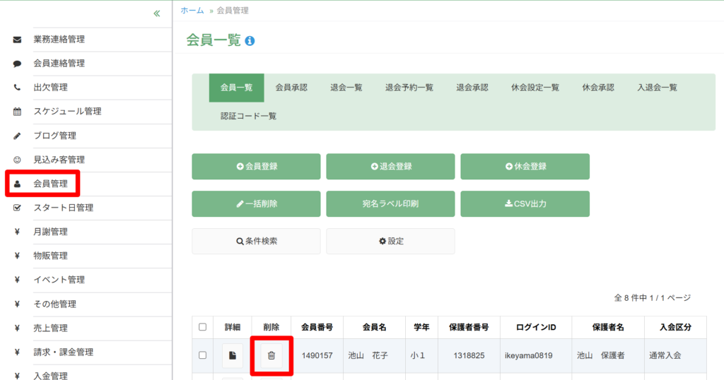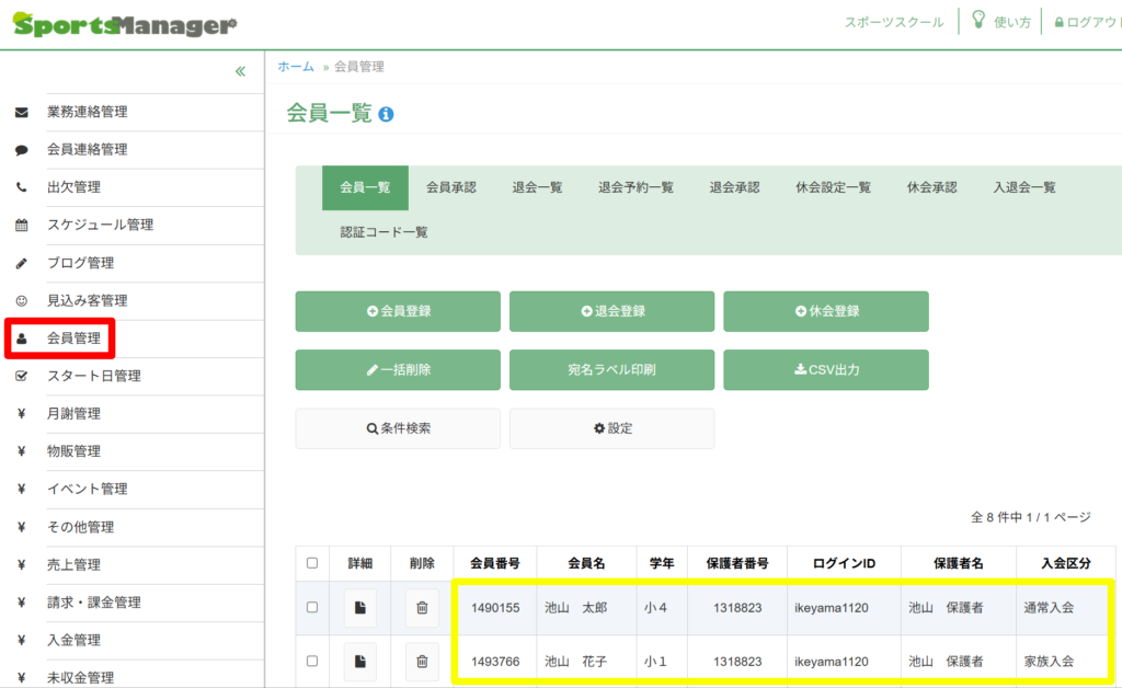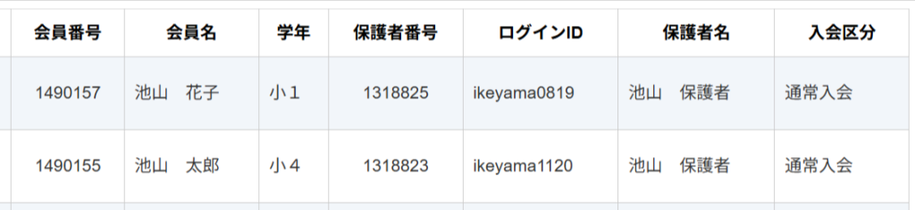 会員管理の会員一覧から太郎さんと花子さんを見ると、保護者番号とログインIDが同じであり、花子さん(妹)の入会区分が「家族入会」になっていることがわかります。