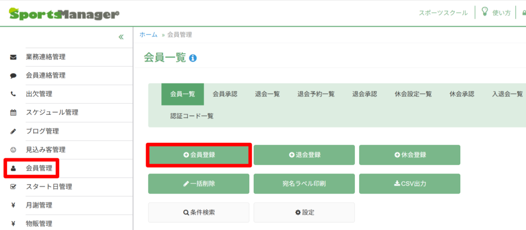 会員管理の会員一覧で、通常入会で登録した花子さん(妹)を探します。(条件検索も可能です。)