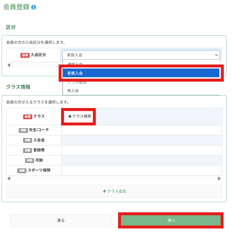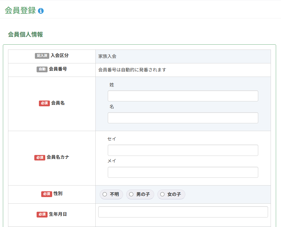 ※既存会員に兄弟を紐づけたい場合は、後から入会させる会員を「家族入会」で会員登録することをおすすめいたします。