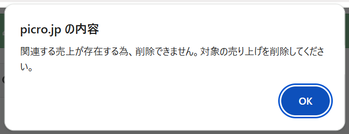 上記2つのどちらかの画面が表示された場合は、会員に紐づいている売上の削除が必要です。